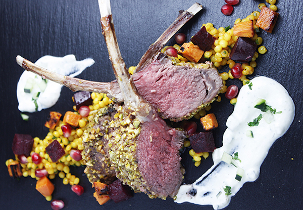 While the couscous continues to cook, season both sides of the steaks with salt, pepper and the crushed grains of paradise, firmly pressing the seasonings into the steaks.